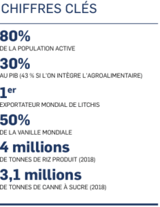 La place de l’agriculture dans l’économie nationale est prépondérante. La population active est très majoritairement agricole (80%) et comporte très peu d’emplois salariés. L’alimentation malgache est basée sur quatre types de céréales : le riz, le manioc, le maïs et la patate douce. Le pays compte 36 millions d’hectares de terres cultivables, dont 3 millions seulement sont exploités.