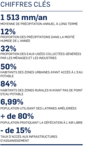 Le secteur Eau, Assainissement et Hygiène revêt un caractère prioritaire au niveau des engagements nationaux pris dans le cadre du développement du Pays. Les disparités entre les zones urbaines et rurales sont considérables : un peu plus de 69% des personnes vivant dans les zones urbaines ont accès à un approvisionnement en eau potable et près de 41% des habitants des zones rurales ne disposent pas de point d’eau et sont contraints à utiliser des eaux de sources non protégées. Seulement 17% de la population utilisent des latrines améliorées, et plus de 40% de la population pratiquent encore la défécation à l’air libre, avec un total de plus de 15 millions de personnes.